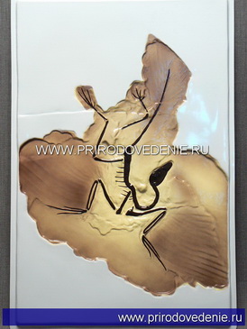 Модель изготовлена из пластмассы путём вакуумного формования. Изображает слепок с археологической находки. Модель раскрашена в соответствии с археологической находкой археоптерикса, найденного в отложениях середины мезозойской эры. На модели изображен отпечаток археоптерикса. Эта первоптица представляет собой переходную форму, имеющую в своем строении признаки птицы с сохранившимися еще чертами пресмыкающегося. Находка археоптерикса в сланцах юрского периода мезозойской эры представляет большой интерес с эволюционной точки зрении.