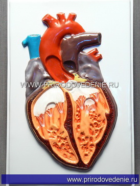 Модель изготовлена из пластмассы путём вакуумного формования. На барельефной модели можно рассмотреть следующие детали строения сердца:
