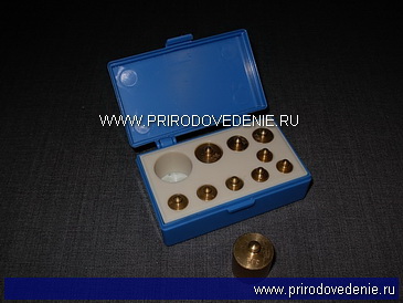 Набор состоит из 10 гирь цилиндрической формы, разных по массе. В комплекте: 2 гири массой 1г, 2 гири массой 2г, 2 гири массой 5г, 2гири массой 10г, гиря массой 20г и гиря массой 50г. На каждой гирьке указана ее масса. Набор упакован в пластмассовую коробку, каждая гирька хранится в своей ячейке.