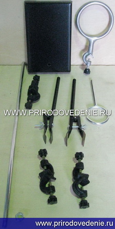 Конструкция штатива позволяет располагать муфты на различной высоте и вращать их во всех плоскостях, что облегчает монтаж установок и приборов.