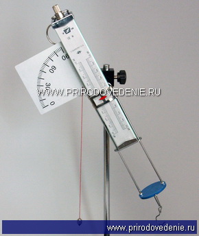 Прибор представляет собой пружину, работающую на растяжение и сжатие. Пружина установлена в металлическом корпусе, на котором имеется оцифрованная шкала в единицах силы (Н). К пружине прикреплена визирная рамка и обойма с площадкой для снаряда (шарика). Прибор снабжен угломером и стержнем для закрепления на штативе. Прибор позволяет определять зависимость силы упругости пружины от ее удлинения, жесткость пружины, дальность полета снаряда при горизонтальной стрельбе; исследовать зависимость дальности полета снаряда от угла вылета; сравнить работу силы упругости с изменением кинетической энергии тела.